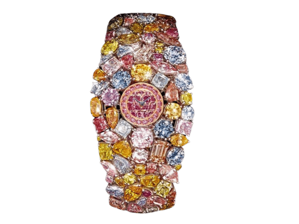 تتميز ساعة “Hallucination” بثمانية ألوان مختلفة من الألماس، بما في ذلك الألماس الوردي النادر الذي يبلغ سعره حوالي 2 مليون دولار للقيراط الواحد. تحتوي الساعة أيضًا على قرص صغير مزين بألماس وردي يشبه الحلوى. استغرق تصميم هذه الساعة الفريدة وصنعها أكثر من عامين ونصف بمشاركة فريق يضم 30 متخصصًا ومصممًا وصائغًا.