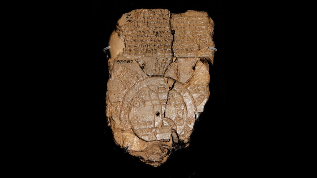 هذه الخريطة الطينية، المعروفة باسم “إيماغو موندي”، تعود إلى موقع سيبار في العراق القديم. تضع بابل في مركز العالم، محاطة ببحر دائري يمثل “البحر المالح”. تجمع الخريطة بين مكونات جغرافية وأخرى أسطورية، مما يعكس رؤية البابليين للكون ومكان الإنسان فيه. وتُعتبر اليوم أقدم خريطة عالمية معروفة تُظهر تصورًا كونيًا متكاملاً للعالم.