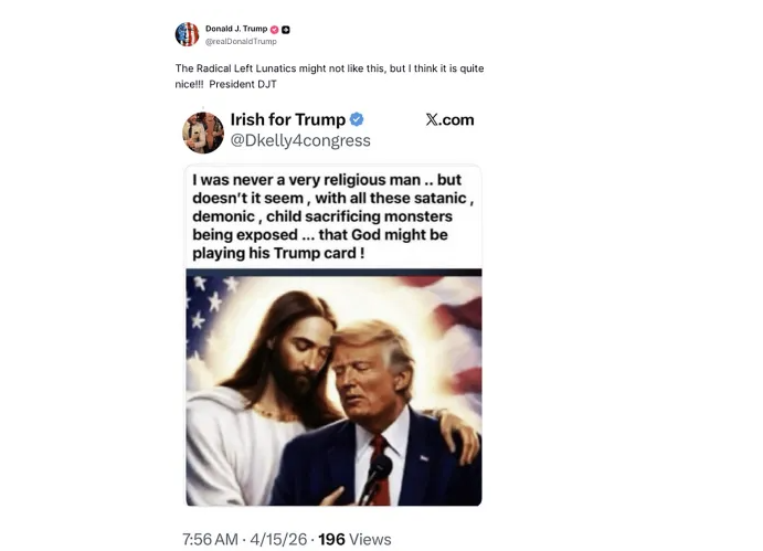 وتظهر الصورة دونالد ترمب وعيناه مغمضتان وهو يلمس جبينه جبين “السيد المسيح”، مع خلفية تتضمن العلم الأمريكي. فيما رافق المنشور تعليق مثير للجدل اعتبر فيه أن الصورة “قد لا تعجب المتطرفين اليساريين لكنها لطيفة جدًا”.